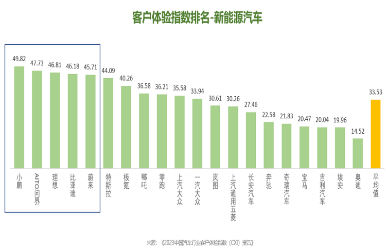 產(chǎn)品CXI的得分普遍較高,以特斯拉、蔚來、理想為代表的新勢(shì)力表現(xiàn)更佳;從銷售服務(wù)CXI看,以小鵬、問界、理想為代表的新勢(shì)力的銷售服務(wù)體驗(yàn)普遍好于傳統(tǒng)品牌;但是,售后服務(wù)的CXI得分整體較低,以上汽大眾、比亞迪、一汽大眾為代表的部分傳統(tǒng)品牌的售后服務(wù)體驗(yàn)相對(duì)較好。