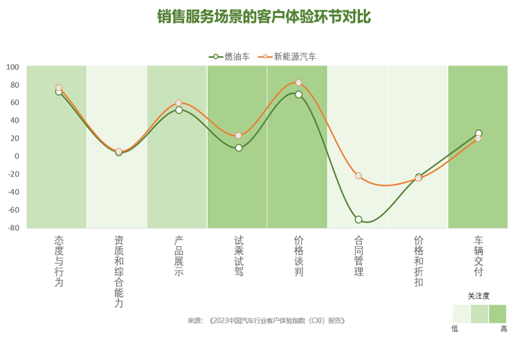 在試乘試駕、價(jià)格談判和合同管理等環(huán)節(jié),新能源汽車的客戶體驗(yàn)均優(yōu)于燃油車。