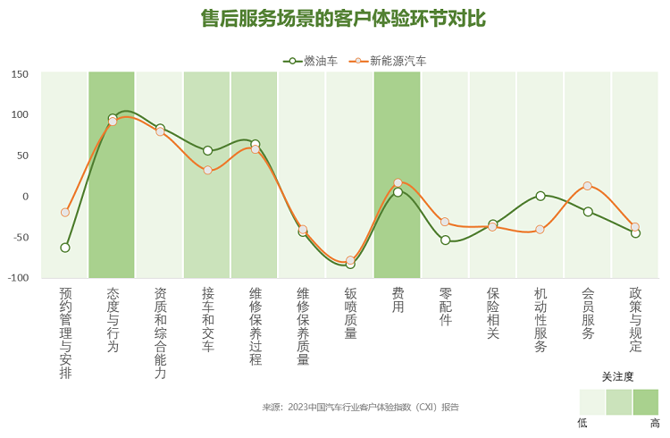 在預(yù)約管理與安排、費(fèi)用、零配件、會(huì)員服務(wù)等環(huán)節(jié),新能源汽車的客戶體驗(yàn)均優(yōu)于燃油車,而燃油車在接車交車、機(jī)動(dòng)性服務(wù)方面表現(xiàn)更好。