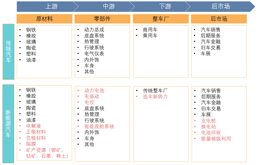 ?由于傳統(tǒng)燃油汽車與新能源汽車在結(jié)構(gòu)上有所不同,因此,兩者的產(chǎn)業(yè)鏈上下游也有所差異。傳統(tǒng)燃油汽車與新能源汽車在結(jié)構(gòu)上的差別主要體現(xiàn)在動(dòng)力端。對(duì)于傳統(tǒng)燃油汽車,發(fā)動(dòng)機(jī)、變速箱組成的動(dòng)力總成是最核心的零部件;而對(duì)于純電動(dòng)汽車,核心動(dòng)力總成則變成了電池、電機(jī)、電控三電系統(tǒng)。這種結(jié)構(gòu)上的差異在產(chǎn)業(yè)鏈上下游的具體體現(xiàn)為: