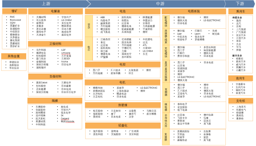?1、新能源汽車產(chǎn)業(yè)鏈上游除傳統(tǒng)燃油汽車所需的原材料外,還增加了動(dòng)力電池生產(chǎn)所需的電解液、正極材料、負(fù)極材料等;