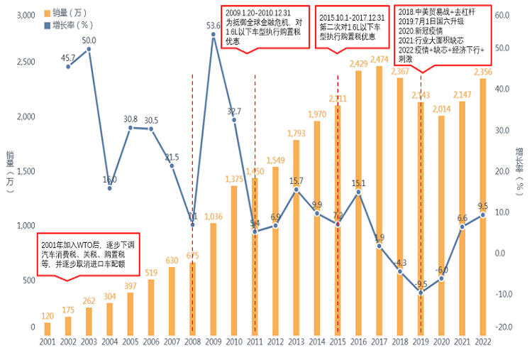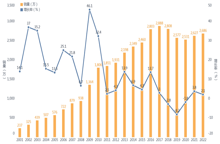 圖1:2001-2022年我國(guó)汽車銷量及增長(zhǎng)率,數(shù)據(jù)來(lái)源:中汽協(xié)
