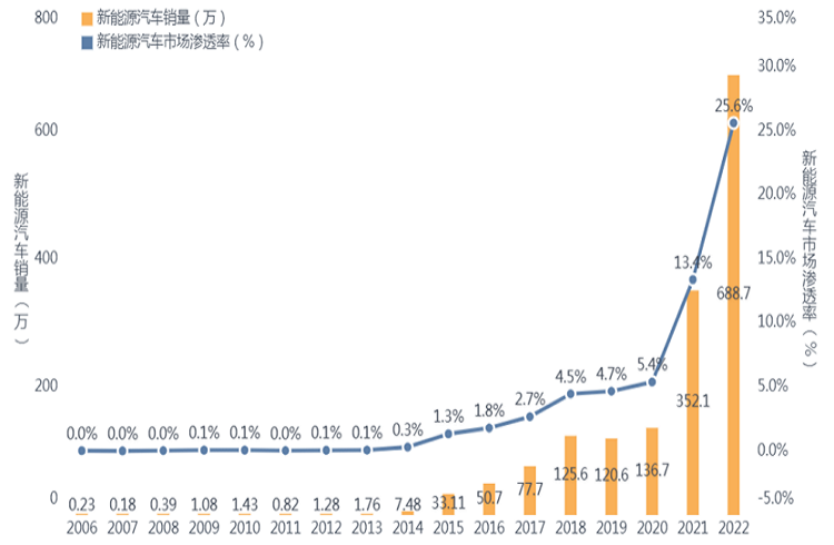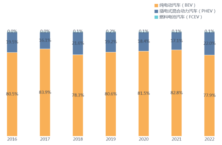 ?新能源汽車主要包括純電動(dòng)汽車(BEV)、插電式混合動(dòng)力汽車(PHEV)及燃料電池汽車(FCEV)。2012年,我國(guó)發(fā)布了《節(jié)能與新能源汽車產(chǎn)業(yè)發(fā)展規(guī)劃(2012-2020年)》,明確以純電驅(qū)動(dòng)為新能源汽車發(fā)展和汽車工業(yè)轉(zhuǎn)型的主要戰(zhàn)略取向。自此,我國(guó)堅(jiān)持純電驅(qū)動(dòng)戰(zhàn)略取向,純電動(dòng)車型始終占據(jù)市場(chǎng)主導(dǎo)地位。根據(jù)中國(guó)汽車工業(yè)協(xié)會(huì)統(tǒng)計(jì),2022年,我國(guó)純電動(dòng)汽車(BEV)銷量536.5萬(wàn)輛,插電式混動(dòng)汽車(PHEV)銷量151.8萬(wàn)輛,燃料電池汽車(FCEV)銷量0.3萬(wàn)輛,占比分別為77.9%、22.0%、0.1%。