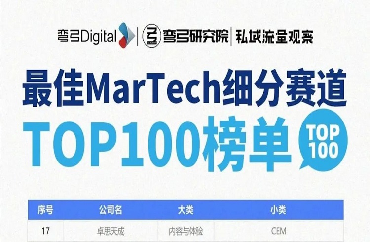 2023年9月21日,由中國廣告協(xié)會指導,彎弓Digital、中廣協(xié)國際傳播工委會等聯(lián)合發(fā)布“2023中國MarTech500強競爭力研究榜單”及“最佳MarTech細分賽道TOP100榜單”。 張家口金融控股集團有限公司(以下簡稱:金控集團)被投企業(yè)——國內頭部CEM客戶體驗管理平臺北京卓思天成數據咨詢股份有限公司(以下簡稱:卓思)榮登“TOP500強”榜單,并位列“TOP100強”CEM細分賽道第一。