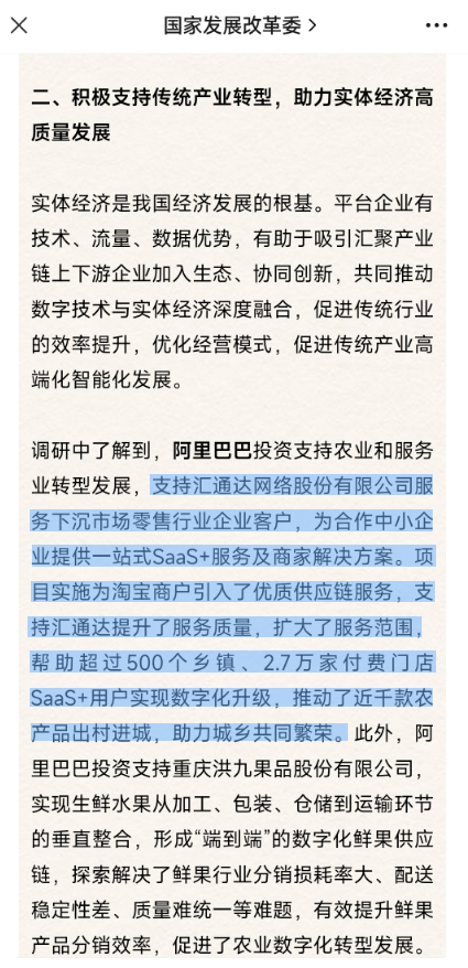 ?2023年7月12日,國(guó)家發(fā)展改革委(公眾號(hào):國(guó)家發(fā)展改革委)在《平臺(tái)企業(yè)在支持科技創(chuàng)新、傳統(tǒng)產(chǎn)業(yè)轉(zhuǎn)型方面形成了一批典型案例》一文中,將匯通達(dá)網(wǎng)絡(luò)(09878.HK)作為積極支持傳統(tǒng)產(chǎn)業(yè)轉(zhuǎn)型,助力實(shí)體經(jīng)濟(jì)高質(zhì)量發(fā)展典型案例提及——“匯通達(dá)網(wǎng)絡(luò)股份有限公司服務(wù)下沉市場(chǎng)零售行業(yè)企業(yè)客戶,為合作中小企業(yè)提供一站式SaaS+服務(wù)及商家解決方案?!?/p>