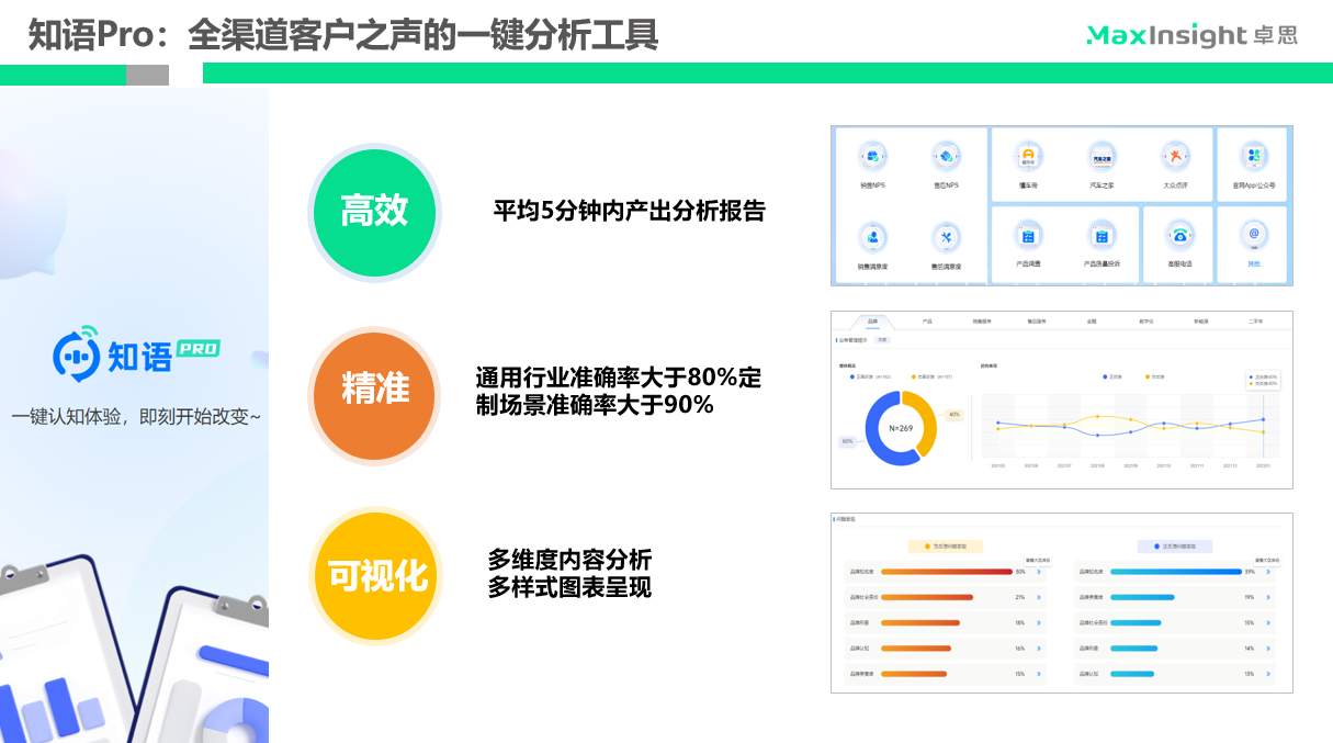 基于多年核心技術研發(fā)與實戰(zhàn)經驗,卓思在客戶體驗管理領域自主研發(fā)了多個SaaS(Software-as-a-Service,軟件即服務)、PaaS(Platform as a Service,平臺即服務)、APP產品,其核心SaaS產品“知語PRO”以強大的Know-how(技術訣竅)和NLP技術(Natural Language Processing,自然語言處理)為驅動,可實現全渠道客戶之聲的高效、精準分析與可視化管理。目前,“知語PRO”已在汽車、房地產、零售、O2O、酒店等多個行業(yè)得到了廣泛應用。在垂直業(yè)務場景下,“知語PRO”的NLP準確率可以達到90%以上,面對百萬字數量級別的客戶之聲,可在5分鐘內產出分析報告,精準鎖定客戶痛點、癢點和悅點,賦能業(yè)務改善和增長。